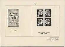 - ↑ See the description: "Auction lot 295 for Doron Waide Auction No. 22, July 22, 2007". StampCircuit.com. Archived from the original on 16 July 2011. Retrieved 2 December 2008. and the image: Wallish, Otte. "Yehudah Essay". StampCircuit.com. Archived from the original on 16 July 2011. Retrieved 8 December 2008.. The first day cover artwork includes a date 5 April 1948 but may have been prepared beforehand.
