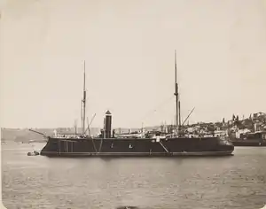 On 14 May 1877, an Ottoman squadron consisting of Iclaliye and the ironclads Avnillah, Muin-i Zafer, Feth-i Bülend, Mukaddeme-i Hayir, and Necm-i Şevket bombarded Russian positions around the Black Sea port of Sokhumi before landing infantry and arming the local populace to start an uprising against the Russians. The Ottomans captured Sokhumi two days later. Over the course of the war, Russian torpedo boats made several attacks on the vessels stationed in the Black Sea, but Iclaliye was not damaged in any of them. These attacks included one launched on 10 June by six torpedo boats, by which point Iclaliye had been transferred to the port of Sulina at the mouth of the Danube, along with Feth-i Bülend and Mukaddeme-i Hayir. During this attack, the boat Chesma targeted Iclaliye, but defensive nets set up around the vessel prevented the torpedo from exploding against her hull. Iclaliye got underway, but was not fast enough to catch the Russian torpedo boats, though one of them was sunk by the explosion of its own torpedo.[10][11][12] After the end of the war, Iclaliye was laid up in Constantinople in 1879.[13]