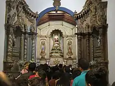 In October 1737, the Book of Deaths started to register deaths in Corumbá de Goiás, where the Chapel of Our Lady of Peñafrancia, inaugurated in 1734 and subordinated to the Rosary Parish, began to be attended by Father Antônio Soares.[1][9] The Chapel of Peñafrancia, elevated to the status of Mother Church in 1840, was the pioneer of the parishes of Abadiânia, Alexânia and Cocalzinho.[10][11][12] The Portuguese influence of the Our Lady of the Rosary Parish replicated the traditions of Pirenópolis in the Chapel of Peñafrancia in Corumbá, such as the Brotherhood of the Blessed Sacrament, Holy Week celebrations, Feast of Saint Sebastian, Feast of the Divine, Choir, Orchestra and band in the masses and processions, as well as the Cavalhadas, held in the city in September during the patron saint's feast.[9]