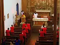 At dusk on Holy Thursday, the crowded church presided over the Foot Washing Ceremony, where the priest, wearing only the lava and the cincture on his cassock, and using the century-old silver basin and pitcher of the Brotherhood of the Blessed Sacrament, washed and kissed the feet of twelve boys, while the orchestra and choir performed Dómine Tu Mihi, specially composed for the Brotherhood of the Blessed Sacrament in 1899 by Antônio da Costa Nascimento, shortly after he had been the confraternity's provider. Also on that occasion, the orchestra played the mandatum for the celebrant to deliver the sermon.[46]