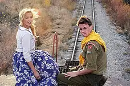 Roy Parker (Ryan Kelley) and friend Ellie (Arielle Kebbel) perch precariously atop a moving train, one of the film's chase scenes, as backlighting by cinematographer T. C. Christensen imparts a halo effect
