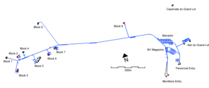 The Camp d'Angevillers is the above-ground component associated with the command centre, located to the north-east of Angevillers. The entries to the ouvrage and the command centre are located just to the north-east of the camp, with more than a kilometre of galleries connecting to the combat blocks on the hill above Rochonvillers.[40]