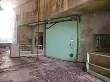 After deactivation in 1967, Rochonvillers was renovated in 1980 as the French First Army's hardened command centre. Work included replacement of the ventilation and filtration system and construction of a blast wall a short distance in front of the main entry. The installation was planned to house 500 people for an extended period, immune to the effects of electromagnetic pulse, radioactivity, chemical weapons and all but a direct hit with a nuclear weapon. The electrical generating plant and underground barracks were renovated. Most exposed concrete faces in the entry blocks were covered with earth as a blast shield,[10] while the combat blocks themselves were used only as antenna mounts. The peacetime 1st Army headquarters was moved from Strasbourg to Metz in 1989, in part to be closer to Rochonvillers.[43] From 1981 to 1998, the command centre was maintained by a small staff in between full-scale exercises. With the disappearance of the Soviet threat, the command centre was deactivated.[37]
