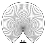 This fossil has the form of a rounded shield, enclosing strongly concentric corrugations or ribs, which weaken adjacent to a triangular neckline. A suture-like zone extends through the center from the apex of the neckline towards the opposite margin. The ribs become wider towards the periphery.[1][2]