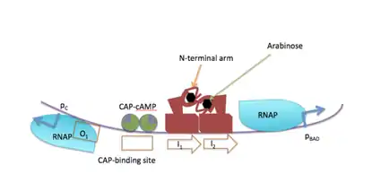 Without arabinose, and regardless of glucose concentration, the PBAD and PC promoters are repressed by AraC.[2][7] The N-terminal arm of AraC interacts with its DNA binding domain, allowing two AraC proteins to bind to the O2 and I1 operator sites.[1] The O2 operator is situated within the araC gene. An AraC dimer also binds to the O1 operator and represses the PC promoter via a negative autoregulatory feedback loop.[2] The two bound AraC proteins dimerize and cause looping of the DNA.[3][4] The looping prevents binding of CAP and RNA Polymerase, which normally activate the transcription of both PBAD and PC.