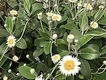 A low robust spreading shrub 1-6 ft. high, rarely more; branches stout, densely tomentose. Leaves crowded at the ends of the branches, 3-7 in. long, 1-4 in. broad, oblong or oblong-ovate or narrow-obovate, obtuse, equal or unequal at the base, quite entire, excessively thick and coriaceous, glabrous and shining above, under-surface thickly clothed with white appressed tomentum, becoming fulvous or red when dry, veins evident on both surfaces; petiole 4-2in. long, stout. Peduncles 1-5 at the ends of the branches, 4-12 in. long, stout, evenly tomentose, naked or with a few foliaceous bracts immediately below the head. Head large, hemispherical, 2-3in. diam.; involucral scales imbricated in many series, tomentose. Ray-florets very numerous; ligules narrow, white. Disc-florets yellow. Pappus of one series of equal scabrid hairs thickened at the tips. Achenes long and slender, silky.[1]