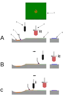 - The transfer pad compresses down onto the substrate, transferring the ink layer picked up from the printing plate to the substrate surface. Then, it lifts off the substrate and returns to the home position, thus completing one print cycle.