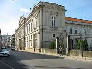 Originally a Dominican friary and house of formation affiliated with the University of Coimbra, the College of St. Thomas was established in 1538. Its name referred to Dominican saint and Doctor of the Church Thomas Aquinas. Construction began in the 1540s under the rector Fr. Martinho de Ledesma, with plans by Asturian architect Diogo de Castilho. The educational and residential areas of the college were arranged around a central cloister. In the 18th century, the upper floor on the east side was expanded and renovated according to contemporary taste, including the addition of new windows and a balcony to the facade.[1]