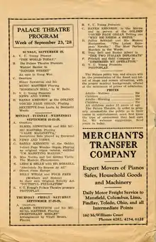 On August 30, 1928, the Marion Palace Theatre opened to a packed house for two performances.[10] At the first performance, Colonel George B. Christian gave a brief opening address.[11] The father of President Warren G. Harding's secretary, George B. Christian Jr., the elder Christian was actively involved in Marion's civic life.[12] His remarks included a short history of theatres in Marion, and he praised the beauty of the building.[12] John Eberson then made a few remarks and introduced Young.[12] He presented Young with a bag of birdseed, a tongue-in-cheek reference to the stuffed pigeons that Eberson had installed to create the feeling of being outdoors at the Palace.[13] The entertainment began with organ music by Banks Kennedy, a well-known Chicago organist.[14] He had written a new composition, which he titled "Everybody's Welcome to the Palace."[12] Next was a theatre overture, "A Night in the Clock Store," by the Palace Orchestra under the direction of Elmer Newstrom. Four vaudeville acts followed: Harry Kahne, a nationally known mental wizard; Tilyou and Rogers, a comedy team; Johnny Mack and Company (including Ethel Dunton, Dolly Moran and Shirley Manion); and the Castlemans, a trio of entertainers. Following the live acts, a Metro-Goldwyn-Mayer silent picture, Excess Baggage (1928 film), starring William Haines, Josephine Dunn and Ricardo Cortez, was shown.[12] The film is now lost.[15] The owner had hoped to open the theatre with the new "talkie" equipment.[16] While the theatre was pre-wired for sound motion pictures, the equipment did not arrive until the following year.[17]