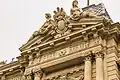 The triangular pediment on central rustication cornice is expressed with heraldic elements and sculpture figures. Architect Nicholas von der Nonne, in his original form, tried to mark the central part with a vivid artistic form, and decorated the form with a decorative dome on it. Vividly profiled cornice with sophisticated architectural detail differs in volume-spatial composition of the building.[8]