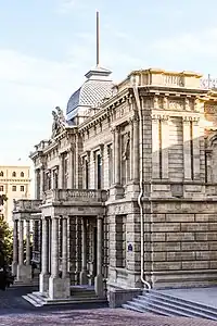 Facade on the side of Niyazi street and specially mentioned and not deep avant-corps which has three axis are divided into two floors with stylobates which are profiled through the whole corps. The central axis is striking with small dome as well. The whole composition of the façade is enriched with lightweight loggia-porticoes of the Ionic order, which is particularly noticeable. This method led to the creation of a composition with landscape. The classic forms of the columns of the visible portico, corinthian order of the avant-corps, the profiles of window frames, and construction of first floor from deep and second floor of lightweight stones creates plastic composition.[7] The palace has unique properties for buildings similar to other building in Baku. In the 1930s, the reconstruction of the land was completed. The volume of the palace was included in the reconstructed garden composition by architect K. İ. Senchikov, which created a whole ensemble.[11]