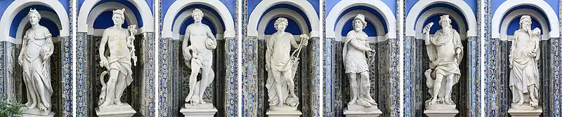The palace garden, an area of 5,5 hectare, is adorned with Portuguese tiles with pictures that represent the different arts as well as mythological figures. The garden hedges are cut in order to represent the different year seasons. There is also a stone staircase which leads to a wall line with busts of the Kings of Portugal.