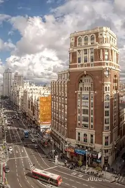 Commissioned by the Madrid Press Association (APM) to serve as corporative headquarters,[1] the building was designed by Pedro Muguruza. The first sketches date from 1924.[2] It was intended to provide a mixed use, including apartments for rent, offices, a movie theatre (ultimately located in the northern end of the plot) and a concert hall.[3] The three different volumes the building features convey this circumstance. The 16-floor southern tower rises to a height of 58 metres.[1]