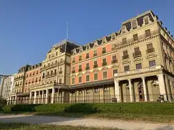 The building, located on the western side of Lake Geneva, is one of the most prominent on the waterfront. The five-story and 225-room building by Lake Geneva was originally constructed in 1873–75 as Hôtel National. When Switzerland joined the then newly created League of Nations in 1920, the premises became the world body's headquarters.[4]