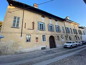 Ugo Foscolo also resided there, in the company of his friend Giulio Gabrielli di Montevecchio, in the years in which he was a university professor in Pavia, which is why the building is now also called "Casa del Foscolo";[2] later the street where the building is located was named after the famous poet. Later the building was inhabited, at different times, by the professor Contardo Ferrini, by the poet Ada Negri and by a young Albert Einstein; the latter stayed there with his family between 1895 and 1896, a period in which his father Hermann ran a factory manufacturing electric machines in Pavia. In the palace he wrote a short essay with the title "On the Investigation of the State of the Ether in a Magnetic Field".[3][4]