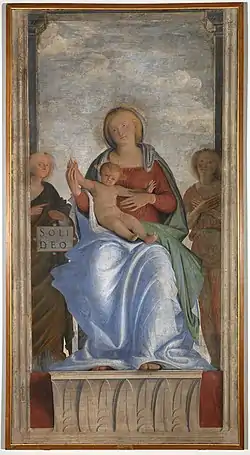 The Palazzo della Ragione Madonna is a fragment of a fresco of c. 1509-1510 by Bramantino, originally on the façade of the Palazzo della Ragione, Milan, and now in the Pinacoteca di Brera in the same city. Due to a reference by Giovanni Paolo Lomazzo it was long misattributed to Bramante, until it entered its present home in 1808.[1]