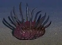 Dinomischus non-applicable non-applicable 13 specimens This cup shaped creature has been in the center of debate since its description in 1977. It sat on the ocean floor with a long stalk, and a small holdfast and was a filter feeder. Recent studies have suggested that it is likely stem-group ctenophoran.[21]
