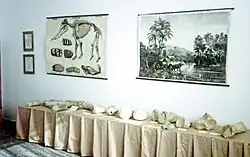 Today it consists of parts of the humerus, thigh, tusk, shin, and shoulder-blade of a mammoth which lived 100,000 years ago, parts of the humerus, shin, and jaw of a rhinoceros and of the lower jaw of a younger rhinoceros, which lived 75,000 years ago, teeth, metatarsals, and talus of a horse of the species antonius, which lived 300,000–400,000 years ago, part of the pelvis and horns of a deer 100,000–400,000 years old, the talus, horntip, and lower part of the humerus of a bovine (75,000 years old), and various shells and rocks.[1]