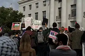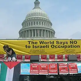 The Palestine lobby in the United States is organized by a number of pro-Palestinian advocacy groups seeking to influence the United States government, institutions, and citizens to actively oppose Israel's occupation of the Palestinian territories, many of them members or cooperating with the U.S. Campaign for Palestinian Rights.[1] These organizations include peace and anti-war, human rights, anti-Zionist, and Arab- and Muslim-American groups.[2] Groups against occupation also include Jewish Voices for Peace[1][3] and Students for Justice in Palestine,[1] among others. Their tactics include education, protest, civil disobedience and lobbying.[4][5][6][7]
