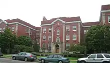 The Georgian Apartments, located at 1981 W. McNichols, was once the center building in the five-building array of apartments. It is a symmetrical, three-story E-plan Georgian Revival structure, and is both larger and differently shaped than the other four original apartment buildings. The building is faced with red brick with limestone trim, and the entire building is topped with a dentil cornice. A retaining wall in the front of the building connects the top and bottom arms of the E, and forms a raised entrance courtyard. Three entrances lead off this court: one in the center leg of the E and one on the inside of each arm.[2]