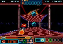Panorama Cotton is a pseudo-3D scrolling shooter reminiscent of Space Harrier, set in an anime-style fantasy world.[3][4] Various levels scroll "into the screen", vertically, horizontally, or diagonally. The player can move Cotton over the screen, shooting at oncoming enemies and avoiding obstacles on her way. Cotton can upgrade her weapon to higher levels as you advance in the game, and can also cast magical spells by collecting special items.