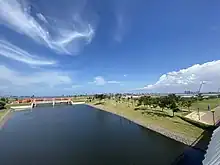 A bridge connecting the reclaimed island with the mainland