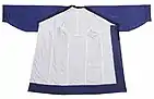 In the Zhou dynasty, paofu was one of the basic clothing worn by the Han Chinese people, along with the Chinese trousers, called ku.[1] The style of paofu which was widely worn in this period is the jiaolingpao, which was a long robe with an overlapping front closing on the right side, a style called jiaoling youren.[1] The jiaolingpao was made with 2-length of fabric which started from the back hem and continued down to the front hem without discontinuity over the shoulders; they were then sewed at the central region of the back and under the arms which often allowed for side vents on the lower side seams to be formed.[1] To form the sleeves, 2 additional pieces of fabrics were sewed together at the shoulder regions of the garment.[1] It was left open in the front, and it could be closed at the waist with a tie or with a belt.[1] Other pieces of fabric could be added to make the width at the sides bigger or to create the overlapping front of the robe.[1]