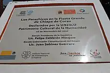 The festivities, which include Roman Catholic religious ceremonies, music, dancing, and local cuisine, were included in UNESCO's Intangible Cultural Heritage Lists on November 16, 2010, listed as "Parachicos in the traditional January feast of Chiapa de Corzo".[1]