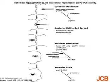 - ↑ Alberti-Segui C, Goeden KR, Higgins DE (2007). "Differential function of Listeria monocytogenes listeriolysin O and phospholipases C in vacuolar dissolution following cell-to-cell spread". Cell Microbiol. 9 (1): 179–95. CiteSeerX 10.1.1.510.3743. doi:10.1111/j.1462-5822.2006.00780.x. PMID 17222191.