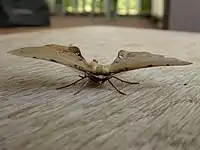The wingspan is about 50 mm. Adults have pale brown wings with variable markings, but usually with three dark marks along each forewing costa. The margin of each forewing is recurved to give a pointed apex.[2]