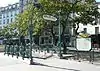However, critics and many of the public were hostile to the libellules in particular, and criticized the green as "German" and the lettering as "un-French"[6] and, according to critic André Hallays in Le Temps, "confus[ing to] little children who are trying to learn their letters and ... stupefy[ing to] foreigners".[21] On the Champs-Élysées, for example at Marbeuf (now part of Franklin D. Roosevelt), simple stone walls with discreet carved signage were used instead,[10] and a plain design was also used at Bourse.[22][23] Unhappiness with Guimard's 1904 design for the Opéra station,[24] described in Le Figaro as having "contorted ramps" and "enormous frog-eye lamps",[25] and increasing costs led to the CMP severing its relationship with him.[5][22] The entrance at Opéra was instead designed by Joseph-Marie Cassien-Bernard, in classical marble.[22][25] The CMP bought Guimard's molds and rights[22] and a total of 141 of his entrances were ultimately produced, the last in 1913.[20]