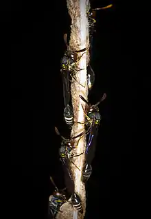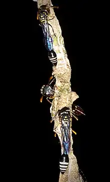 The wasp will defend the nest from conspecific intruders as well.[5] When defending the nest from other flying objects, as soon as some flying movement is detected, the resident wasps begin to follow the object. If the object is small enough to be a conspecific wasp intruder, resident females will begin to buzz their wings and batter it in midair.[7]