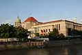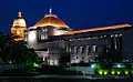 The Parliament House is a public building and a cultural landmark in Singapore. It houses the Parliament of Singapore, and is located in the Civic District of the Downtown Core within the Central Area. Within its vicinity is Raffles Place, which lies across from the Parliament House from the Singapore River, and the Supreme Court's building across the road. The building was designed to represent a contemporary architectural expression of stateliness and authority. The prism-shaped top, designed by President Ong Teng Cheong, was similarly a modernist take on the traditional dome.