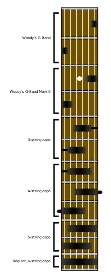 The Third Hand Capo and the SpiderCapo (appearing in 2008) are the only universal capos.[2] Each can clamp any of the 63 combinations of strings at any fret of any guitar. Only the SpiderCapo can produce any combination at a given fret without repositioning the capo. Shubb and Kyser each make a 3-string "E-sus" capo as well as a 5-string "Drop-E" capo. Woodie's G-Band capos clamp 1 or 2 outer strings, and Kyser now makes a series of "K-Lever" capos that incorporate a spring lever to allow temporary fretting of some notes that lie under the capo.