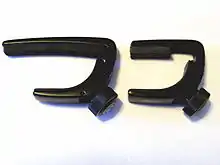 The first partial capo for guitar released, in 1976, was called the "Chord-Forming Capo". It was invented by Lyle Shabram, and called "A Tool For the Creative Musician".[2] Harvey Reid and Jeff Hickey started the Third Hand Capo Co. in Nashville, renaming Shabram's invention "Third Hand Capo". A popular style of partial capo is the "Esus" style, which clamps the A, D, and G strings of a guitar.[2] When placed upon the second fret, it forms an Esus chord, and when turned upside down, it forms an A chord. There are many partial capos on the market today that clamp anywhere from 1 to 5 strings. Many musicians have made their own partial capos by cutting or otherwise modifying existing capos.
