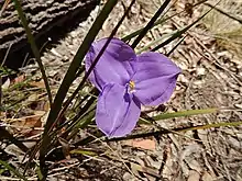Patersonia fragilis, commonly known as swamp iris[2] or short purple-flag,[3] is a species of flowering plant in the family Iridaceae and is endemic to eastern Australia. It is a tufted perennial herb with linear, cylindrical leaves and pale violet to blue-violet flowers.
