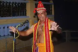 The stage setting and costumes are very simple. Only a lighted traditional lamp known as "Nilavilakku" is used in the stage, and there is no curtain. It has only one actor. Costumes of the actor are very simple and are predominated by the red colour.[1] The costumes of the actor include a red "Kireetam" (or a red silk garment with a knot) on the head, "Chandanatilakam" and "Kunkumatilakam" on the forehead, "Bhasmakkuri" on the body, garlands on the neck and a loose piece of upper body clothing called "Uttariyam".