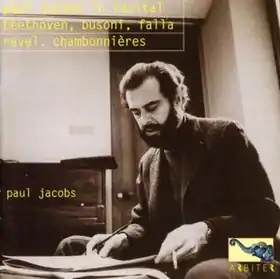 Jacobs began his recording career in Europe in the 1950s. One of his first records (in 1953) was of Beethoven's Second Piano Concerto with the Paris Radio Symphony Orchestra conducted by René Leibowitz, coupled with Leibowitz's own realisation of Beethoven's Piano Concerto in E flat major of 1784, written when Beethoven was 14 and of which only the piano part survives.[29] In Paris in 1956 he gave the first complete performance in a single concert of all of Schoenberg's piano music, going on to record it for the Véga label. He also acted as producer on recordings conducted by René Leibowitz, including the first LP recording of Schoenberg's Gurrelieder. He was the harpsichord soloist in the 1968 Columbia recording of the Carter Double Concerto with Charles Rosen (piano) and the English Chamber Orchestra, conducted by Frederick Prausnitz,[30] and played on the 1970 CRI recording of Morton Feldman's The Viola in My Life.[31]