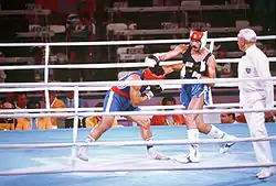 ![]() Tuvale (left) versus Aristides Gonzalez of Puerto Rico at the 1984 Olympics | |