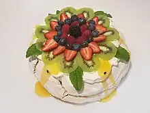 Pavlova is traditionally decorated with a topping of whipped cream and fresh soft fruit such as kiwifruit, passionfruit, and strawberries.[28] Factory-made pavlovas can be purchased at supermarkets and decorated as desired. A commercial product is available that includes pre-mixed ingredients for baking the meringue shell, requiring only the addition of water and sugar.