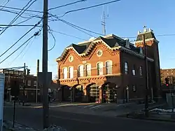 The Peabody Central Fire Station is a historic fire station at 41 Lowell Street in Peabody, Massachusetts, United States. Built in 1873, the two story brick building is one of the oldest active fire stations in the state. The building has Victorian styling, with a mansard roof, and two truncated gables on its front facade. The cornice is studded with regularly spaced brackets, and a tower rises from the building's rear right corner.[2]