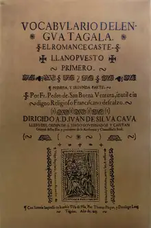 Vocabulario de la lengua tagala (transl. Vocabulary of the Tagalog language) was the first dictionary of the Tagalog language in the Philippines, It was written by the Franciscan friar Pedro de San Buena Ventura and published in Pila, Laguna, in 1613.[1] Juan de Plasencia had written a vocabulario earlier but it was not printed.[2] More than a century later, a dictionary of the same name was prepared by Jesuit priests Juan de Noceda and Pedro de Sanlucar; their first edition was published in Manila in 1754[3] and then the second in 1860,[4] which was reissued by the Komisyon sa Wikang Filipino in 2013.[5][6]