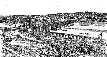 The 1890 Pennsylvania Avenue Bridge was slightly upstream from the location of an earlier 1815 bridge. It had two northwestern abutments made of stone, both of which rose 38 feet (12 m) above the low-water mark. The single southwestern abutment was made of compacted earth covered with stone slabs. There were nine piers in the river itself, each made of brownstone masonry and rising 10 feet (3.0 m) above the low-water mark. Because bedrock could not be located in the riverbed, the piers rested on pilings and grillage.[lower-alpha 1] The substructure of the bridge consisted of iron Pegram trusses. On the northwestern side of the bridge, the trusses from the shore to the first and second abutments were above the bridge, so as not to interfere with the passage of the B&PR trains below the bridge.[1] The other trusses were all slung below the bridge.[1][2] Each of the 10 trusses over the piers was 112 feet (34 m) long and painted dark red. They had a clearance of just 2 to 3 feet (0.61 to 0.91 m) over the high-water mark.[1] The roadway was just 24 feet (7.3 m) wide,[3] and consisted of oak planks over iron beams.[1] Unlike the previous bridges, there was no draw span.[2]