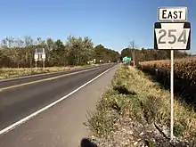 PA 254 begins at an intersection with PA 405 in the borough of Milton in Northumberland County, heading east on two-lane undivided Broadway Street. The road passes through the commercial downtown, crossing Norfolk Southern's Buffalo Line and heading into residential areas. The road heads into Turbot Township and becomes Broadway, reaching an interchange with the PA 147 freeway. Past this, PA 254 becomes an unnamed road and runs through agricultural areas with some woods and homes. The road comes to an interchange with Interstate 80 (I-80), at which point it is a four-lane divided highway, before turning back into a two-lane undivided road and heading northeast through open farmland with occasional residences. The route heads east-northeast into Limestone Township in Montour County and becomes Broadway, running through more rural areas. PA 254 enters Derry Township and becomes Washingtonville Road, crossing the Chillisquaque Creek before coming to an intersection with PA 54 to the south of the borough of Washingtonville. The road heads northeast through more farmland with some woods and homes, turning to the east.[2][3]