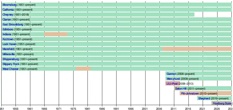 The Pennsylvania State System of Higher Education organized the conference in 1951 to promote competition in men's sports amongst the system's 14 universities.