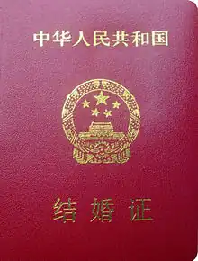 The People's Republic of China Marriage Certificate (Chinese: 中华人民共和国结婚证) is a legal document issued by the Chinese marriage registration authority to prove the valid establishment of a marriage. There are two official marriage certificates, one for each man and woman.[1]