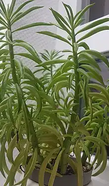 Peperomia ferreyrae is a species of plant in the genus Peperomia native to Peru.[1] It is a small, succulent herb, growing erect to about 20 cm in height. The alternating, typically 3 to 5 cm long leaves, are in the form of tubes resembling green bean pods: U-shaped in cross-section with epidermal windows on the top-side. [2][3]