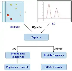 Peptide mass fingerprinting (PMF), also known as protein fingerprinting, is an analytical technique for protein identification in which the unknown protein of interest is first cleaved into smaller peptides, whose absolute masses can be accurately measured with a mass spectrometer such as MALDI-TOF or ESI-TOF.[1] The method was developed in 1993 by several groups independently.[2][3][4][5][6] The peptide masses are compared to either a database containing known protein sequences or even the genome. This is achieved by using computer programs that translate the known genome of the organism into proteins, then theoretically cut the proteins into peptides, and calculate the absolute masses of the peptides from each protein. They then compare the masses of the peptides of the unknown protein to the theoretical peptide masses of each protein encoded in the genome. The results are statistically analyzed to find the best match.