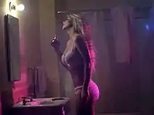 In the music video for "Perfume", Spears stars as the "other woman" of her lover.[36] It begins with several scenes of Spears and her lover (played by Alexander Kjellevik) out of a motel and then on its roof drinking beer, inside a van, walking on the street, bathing in a pool, resting on a bed in her bra and panties and some hugs in the desert sunset. Spears gives him a crooked nail ring, symbolizing the simple love between them. After the first part, Spears is wearing lingerie inside a bathroom, putting on her Fantasy perfume and looking at the mirror, when an iPhone 5S sounds and displays Cindy's name. Spears then watches from a truck as her lover joins Cindy on a gas station in the desert. As Spears flees to a motel room to lament alone, her lover repeats the same activities with Cindy that he did with her – walking on the street, swimming in the pool, and drinking on the roof of a motel. At the end, her lover gives Cindy the crooked nail ring Spears once gave him, while she is still alone lamenting in the motel room and the video ends with the title "Perfume" on the screen.