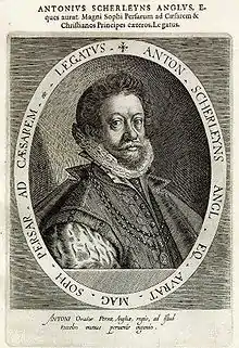 The embassy was composed of one ambassador, Hossein Ali Beg, and four secretaries (First Secretary Uruch Beg, son of Sultan Ali Beg; the nephew of the ambassador 'Ali Quli Beg; and two others) and led by the English adventurer Sir Anthony Shirley.[4][5] Shirley had sailed from Venice on 24 May 1599 with 25 other Englishmen, bound for Aleppo, and had found favour with King Abbas I. [6] [4] Various contacts had already taken place between the Persians and Europe, as with the embassy of Anthony Jenkinson from Queen Elizabeth I in 1562.[5]